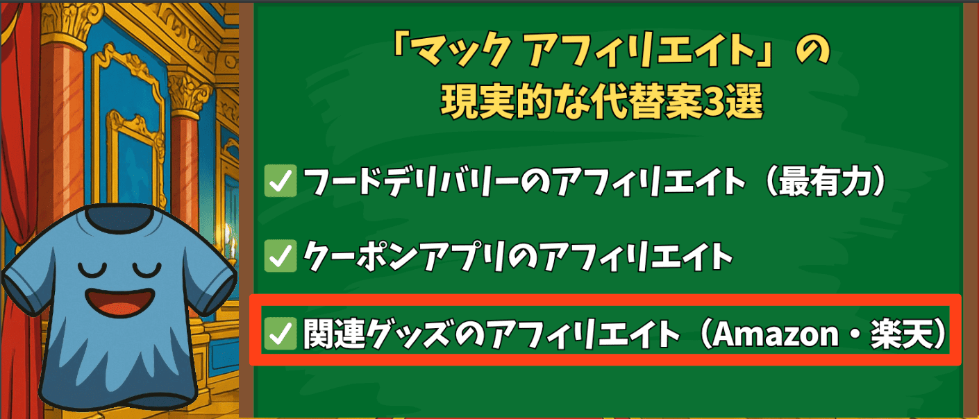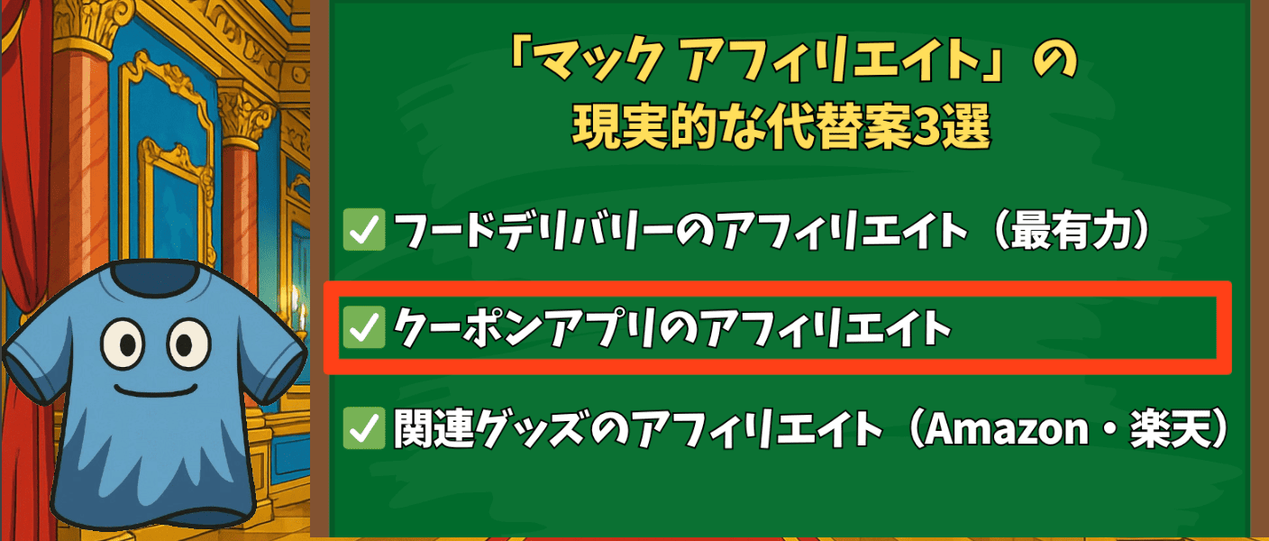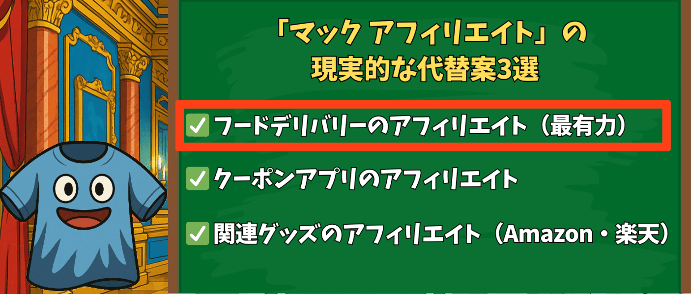 - 最も現実的な代替案は、「ウーバーイーツ」や「出前館」といったフードデリバリーサービスのアフィリエイトである。