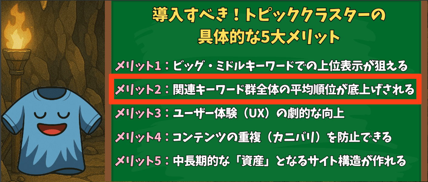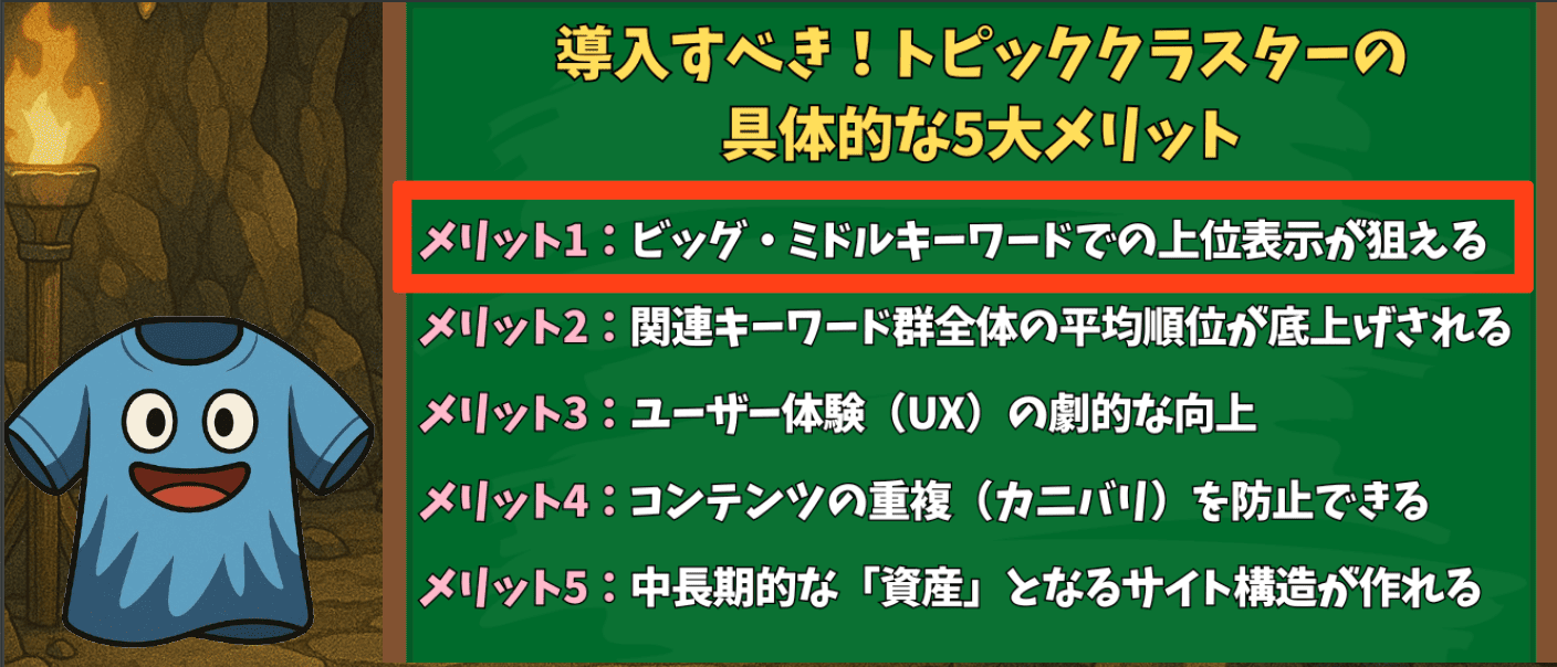 トピッククラスター戦略を導入することで、具体的にどのようなSEO効果やメリットが得られるのでしょうか。