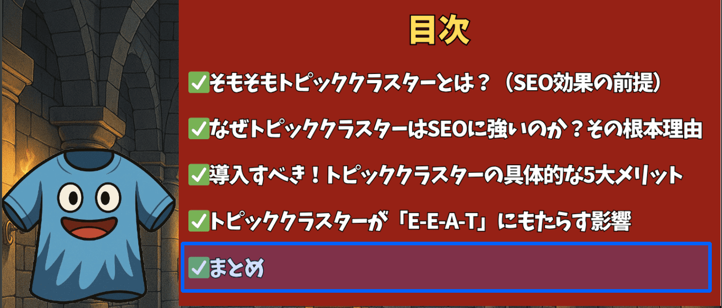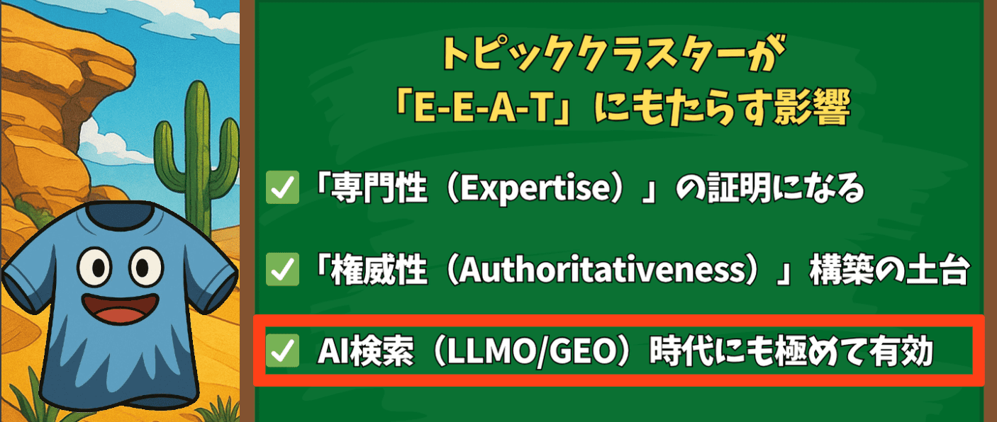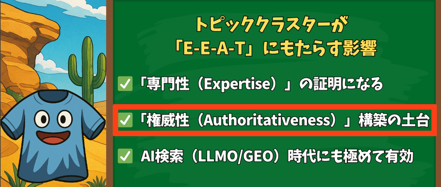 なにより、この戦略はサイトの「専門性」と「権威性」を構造的に証明するE-E-A-T対策でもあり、今後のAI検索時代を勝ち抜くためにも不可欠です。