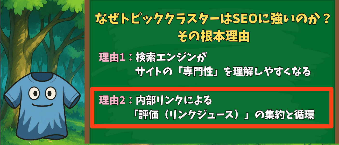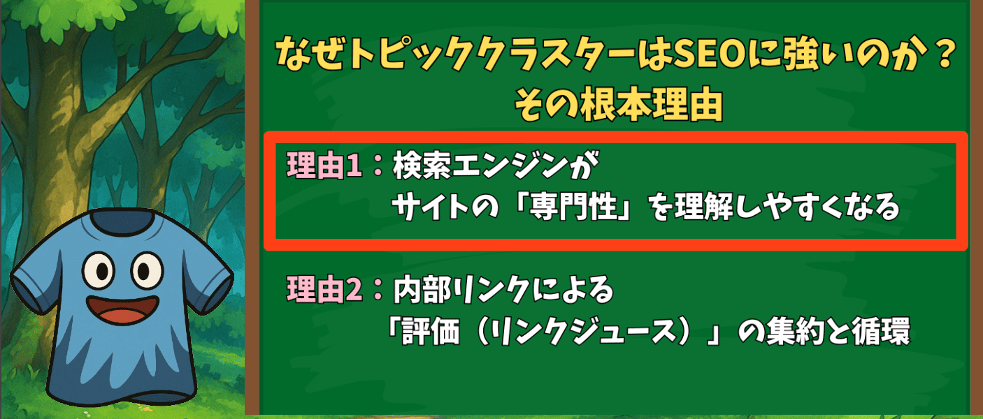 トピッククラスターがSEOに強い根本的な理由は、検索エンジンがサイトの「専門性」を文脈で理解しやすくなり、内部リンクによって「評価」が集約・循環する点にあります。