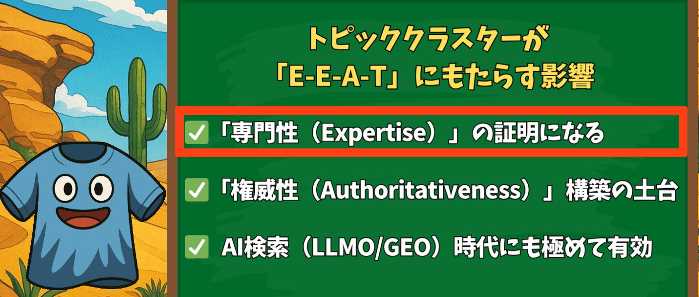 トピッククラスター戦略は、このE-E-A-T、特に「専門性(Expertise)」と「権威性(Authoritativeness)」の向上に大きな影響を与えます。